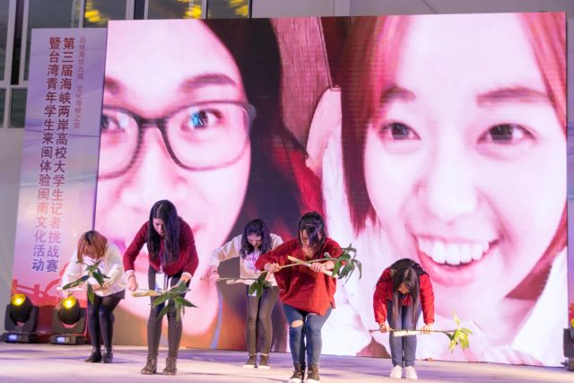 揚閔也坦言,在專業與技術的層面無法勝過其他傳播背景的隊伍,只好另外殺出一條血路,在創意上下足功夫。展演時,揚閔與組員以「模擬連線」的方式展現:舞台螢幕上出現的是預先剪輯好的影片,身在舞台上的揚閔,與影片中人在台灣的朋友分享在走訪泉州的點滴,許多景點也以表演與舞蹈呈現,如孔廟的八佾舞、天后宮的求籤儀式,都成為表演素材。而表演結束之前,全部的組員也分享了活動心得與收穫,背景也配上由景點串接起來的影片,「即使在技術層面比不上其他組,我們還是盡力用創意補足中間的差距。」回憶起當時,揚閔說,因為接連著幾天熬夜,連日的疲憊使得大家士氣低迷,然而練習時仍努力做到最好,最後完成表演時,也感到莫大的成就感與滿足。